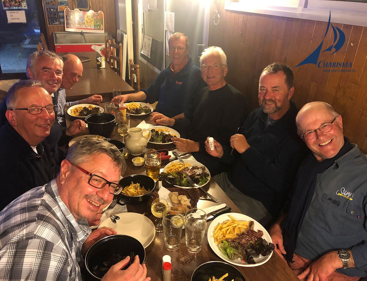 Die bizarre Landschaft der Bretagne ist auch in grauer Szenerie einzigartig und zieht die Crew in ihren Bann. Am frühen Abend machen wir nach 44 sm in der Marina von L‘Aber Wrac'h fest. Nach einem Anleger im Cockpit verholen wir uns an Land. Im Café du Port genießen wir die bretonische Küche. Klar, dass da frische Austern, Muscheln und flambierte Crêpes mit von der Partie sind. Eine lebhafte Runde an Bord beschließt diesen ereignisreichen Segeltag.