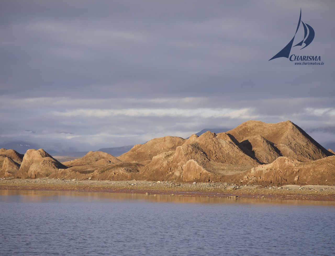 Für die Nacht steuern wir den Ekmanfjorden an. Der Anker fällt nördlich von Flintholmen, einer kleinen Insel mit skurilen Erdhügeln. Der Anblick erinnert an übergroße Maulwurfshügel. Manch einer sieht auch überdimensionale Toblerone-Stücke. Wir liegen gut geschützt in imposanter Szenerie: Am nordwestlichen Ufer die Ausläufer des Sefströmbreen, am Ostufer Pyramiden-Berge und südlich die Maulwurfsinsel. Besser geht's nicht.