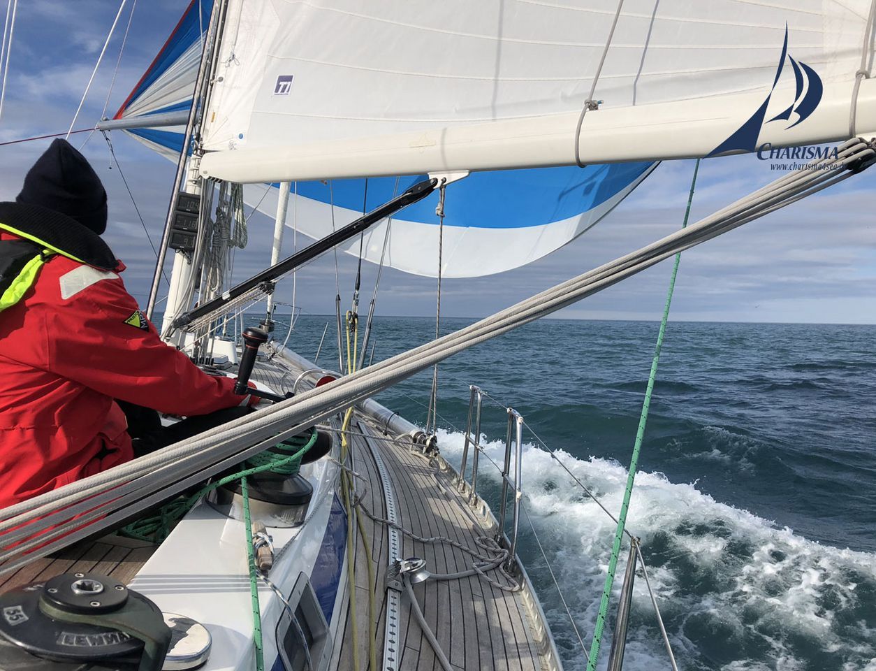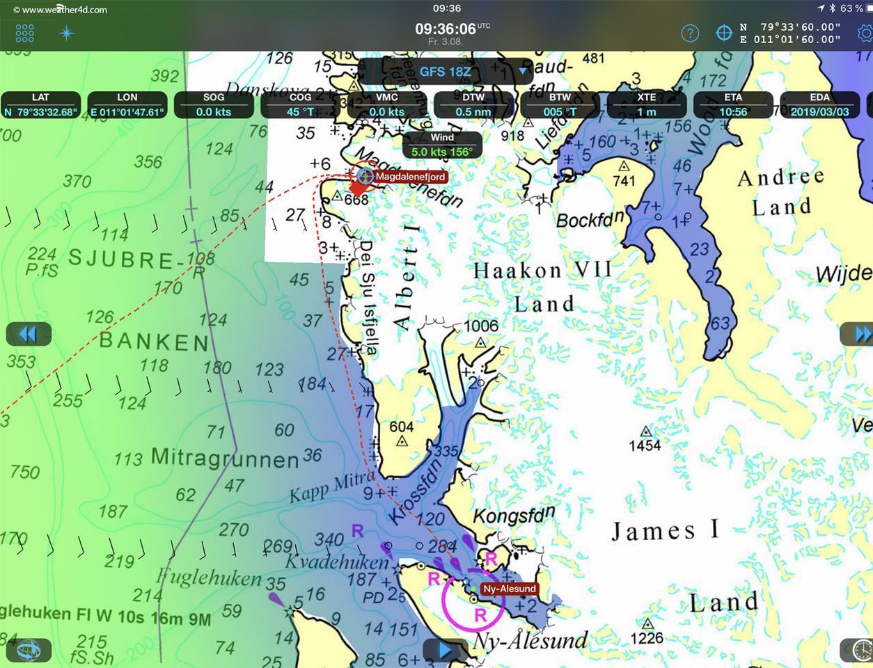 Der angekündigte SO-Wind setzt sich durch und wir segeln erst unter Genua II und dann unter Spinnaker gen Westen. Um das Flach vor Kap Mitra zu passieren fahren wir eine Schifte und bringen den Spinnaker von Steuerbord- auf Backbordbug. Mit bis zu 9 kn FüG rauschen wir durch den Kongsfjord. Der Wind dreht auf SW und fällt vorlich ein. Mit Annäherung an das Kap frischt es erwartungsgemäß weiter auf. Wir absolvieren bei konzentrierter Steuerleistung ein sportliches Spinnaker-Training.