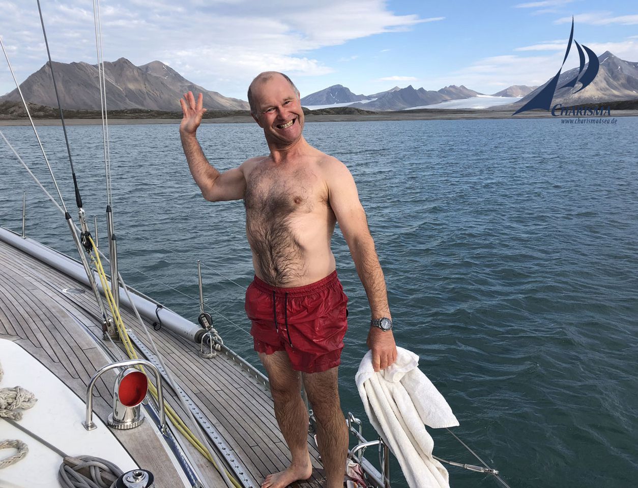 Dem Erlebnis Mitternachtssonne folgt nach dem Ausschlafen ein morgendliches Eisbad. Das geübte Bade-Trio bekommt von Steuerbord-Achtern Zuwachs. Nach dem Frühstück hält es selbst den Käpt'n nicht mehr im warmen Salon - auch er wagt sich ins eisige Nass!