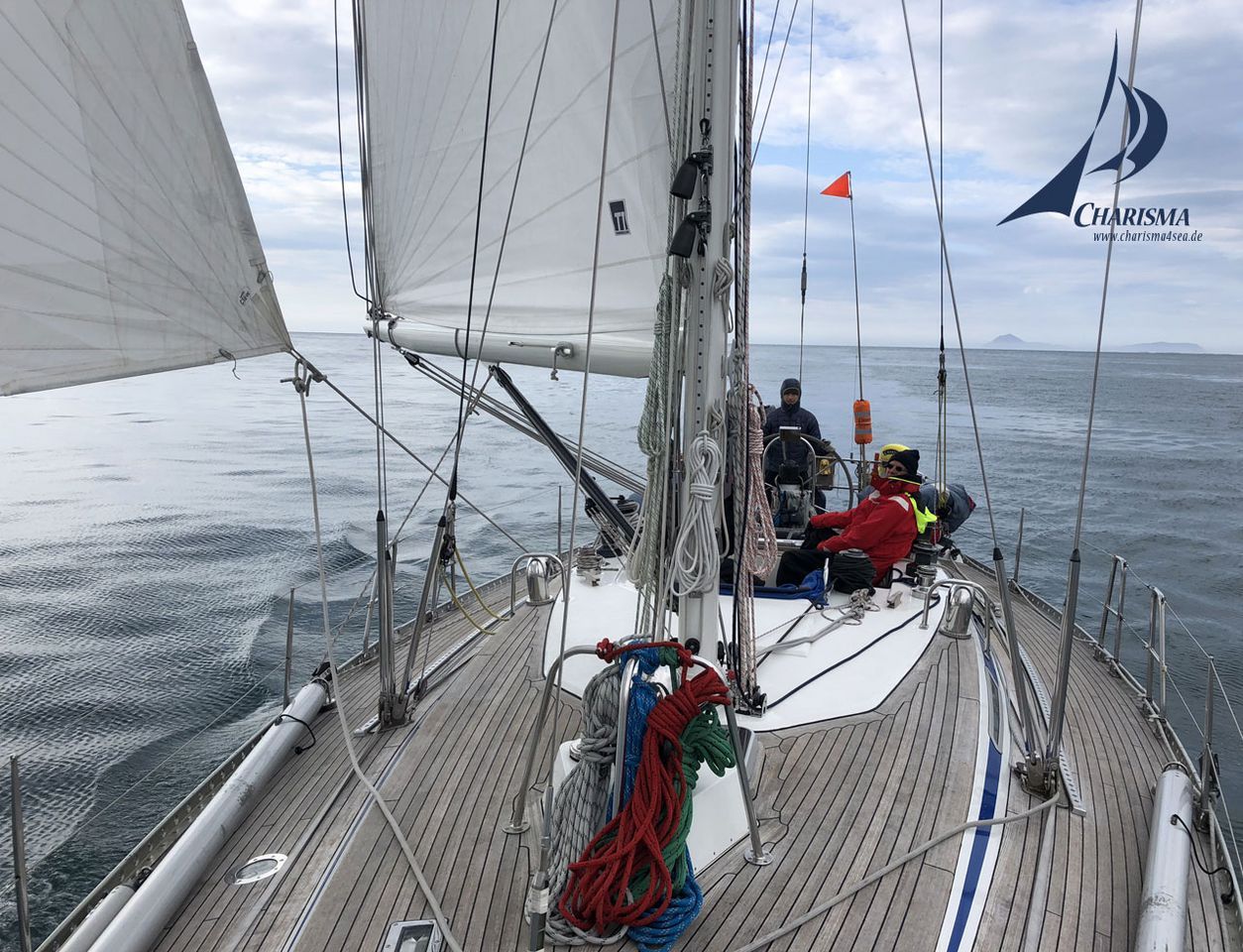 Gegen 10:30 Uhr holen wir den Anker auf und verlassen die Eidembukta bei Nord-Wind (4 Beaufort) unter Genua gen Süden. Wir setzen das Großsegel und machen bei zunehmendem Seegang schnelle Fahrt in die Mündung des Isfjords. Mit Passieren von Dautmannsodden kommen wir in die Landabdeckung - der Seegang lässt nach, der Wind mit der Zeit auch. Wir nehmen eine Flauten-Suppe zu uns und schlagen bei 110° am Kompass Kurs Grönfjord ein. Vor uns biegt das alte Hurtigrutenschiff MS Nordstjernen in den Fjord ein.