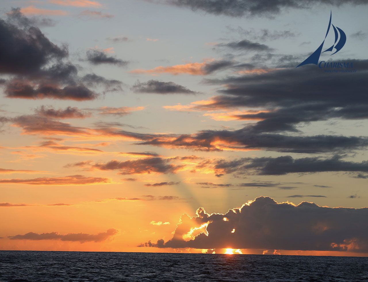 Auf den anfänglichen Am-Wind-Kurs reagieren wir mit Reffmanövern. Im Tagesverlauf können wir dann bei Halbwind-Kurs ausreffen. Wir segeln in eine brillante Abendstimmung und bringen in der Dämmerung vor Deshaies den Anker aus. Distanz: 51 sm.