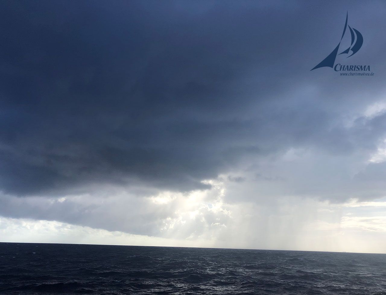 Mittlerweile haben wir das Großsegel ins ersten Reff gesetzt. Als es am Ruder zu aufwändig wird, binden wir das zweite Reff ein. Der Wind dreht rechts, wir baumen die Genua auf Steuerbord aus. Seit geraumer Zeit ist jedoch eine Wolkenwalze auffällig. Sie scheint sich vorübergehend aufzulösen. Aber dann intensiviert sie sich doch und beginnt als langes Band über uns hinweg zu ziehen. In Folge dessen dreht der Wind wieder zurück. Wir führen das Vorsegel auf Backbord und bauen die ausgebaumte Konstruktion wieder ab.