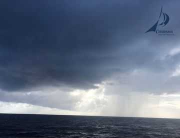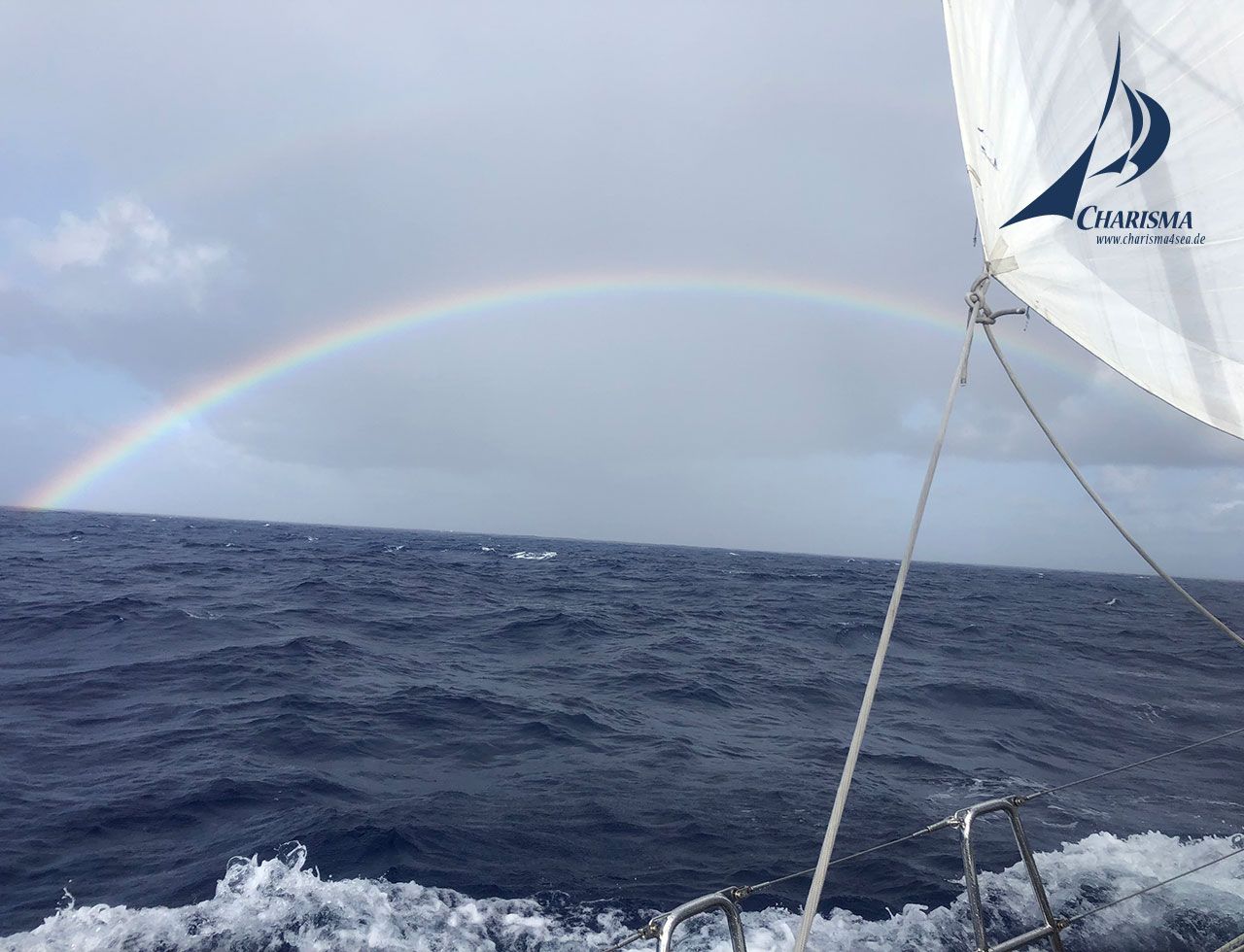 Wir segeln in einen sonnigen Morgen und kommen gut voran. Der Blick zum Himmel verheist erneut das Aufkommen eines nächsten Squalls. Da wir jedoch weiterhin ausschließlich unter leicht reduzierter Genua segeln, ergeben sich für uns keine weiteren ToDos. Im Gegenteil – es entwickelt sich neben gigantischer Quellbewölkung ein Regenbogen, der uns in seinen Bann zieht. Anschließend setzen sich wieder kontinuierliche Passatbedingungen durch – das ist gut an der "sauberen" Bewölkung zu erkennen.